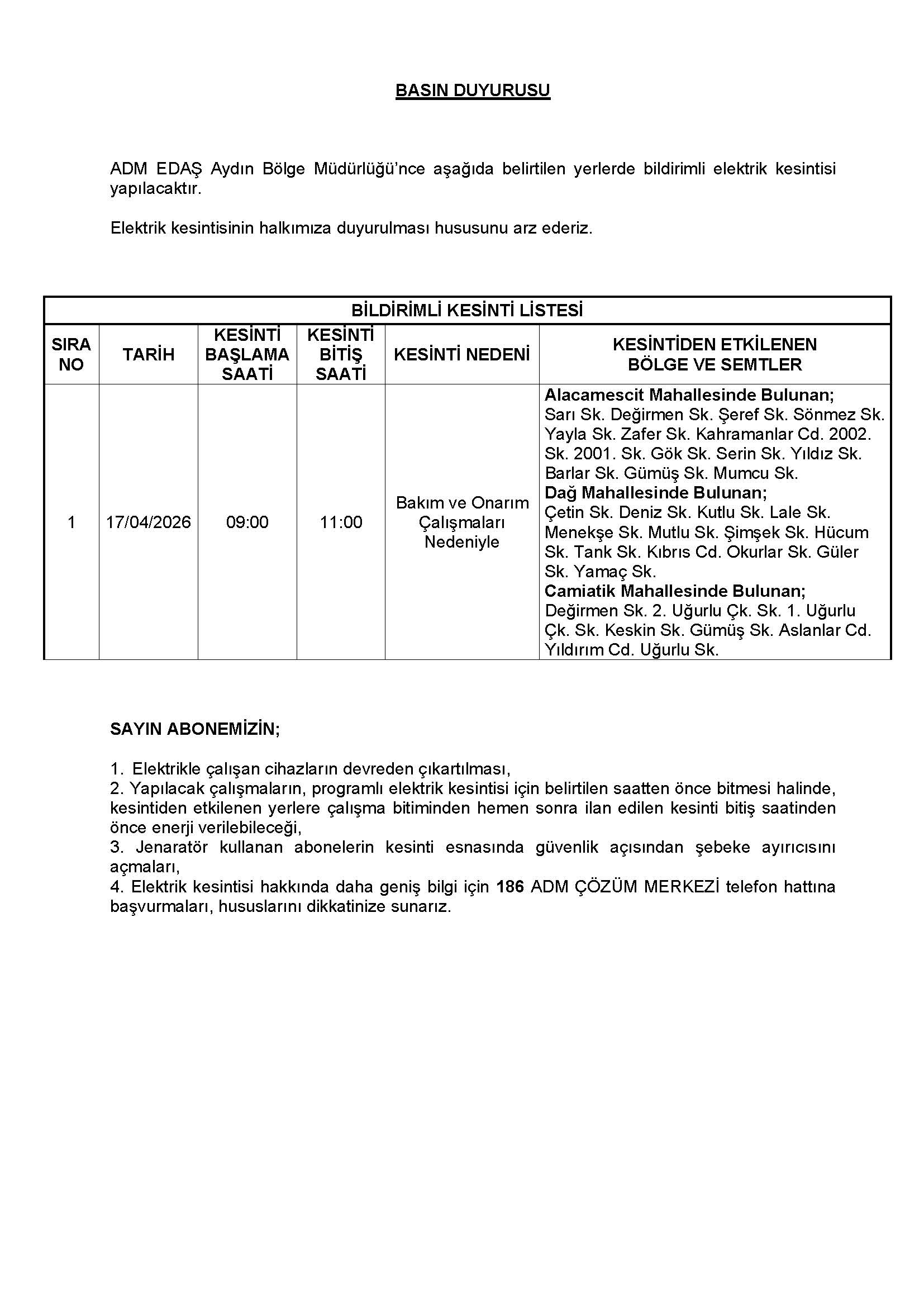 17 Nisan 2026 Elektrik Kesintisi Duyurusu