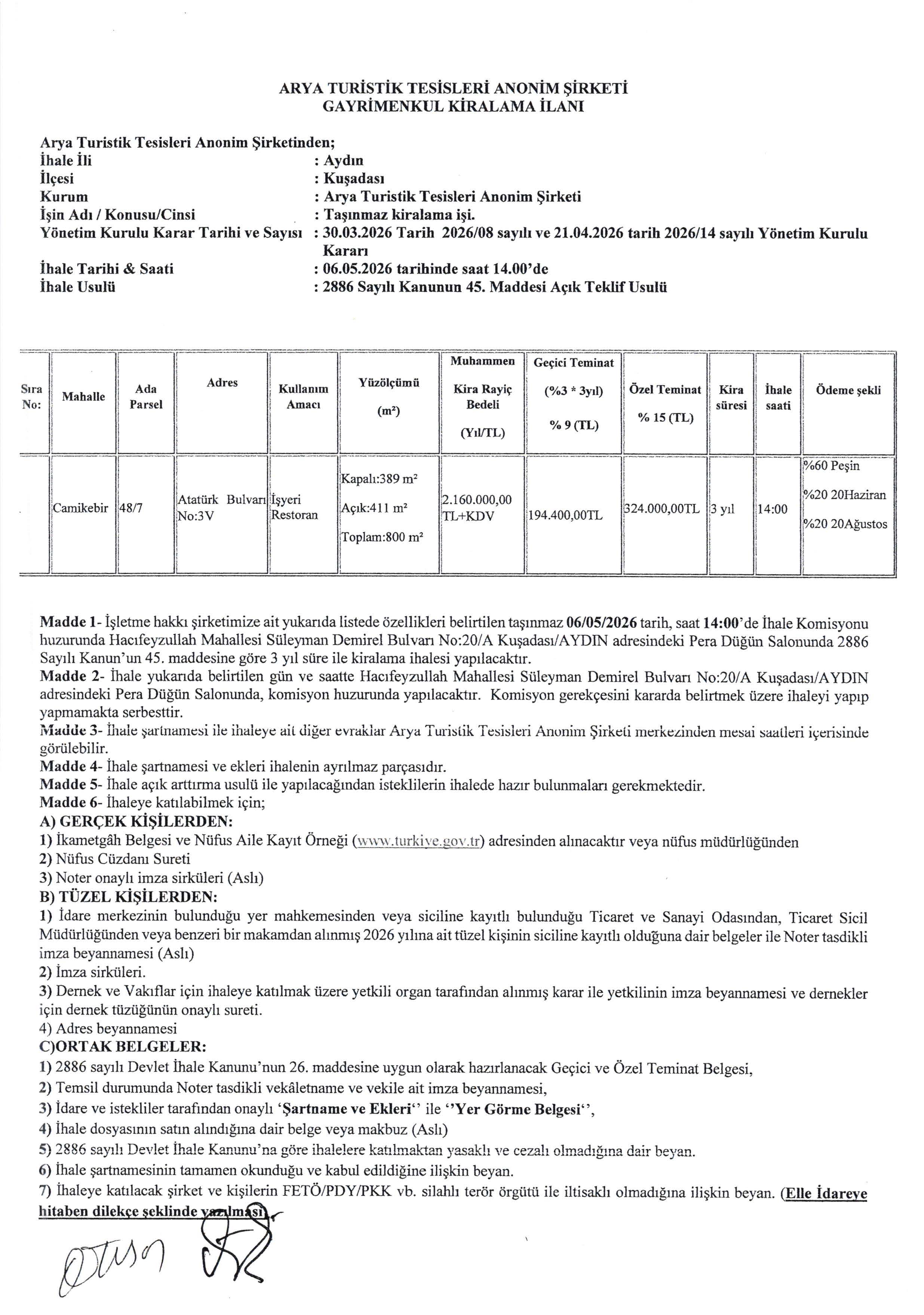 Arya Turistik Tesisleri A.Ş.'den 06/05/2026 Tarihli Gayrimenkul Kiralama İhalesi İlanı