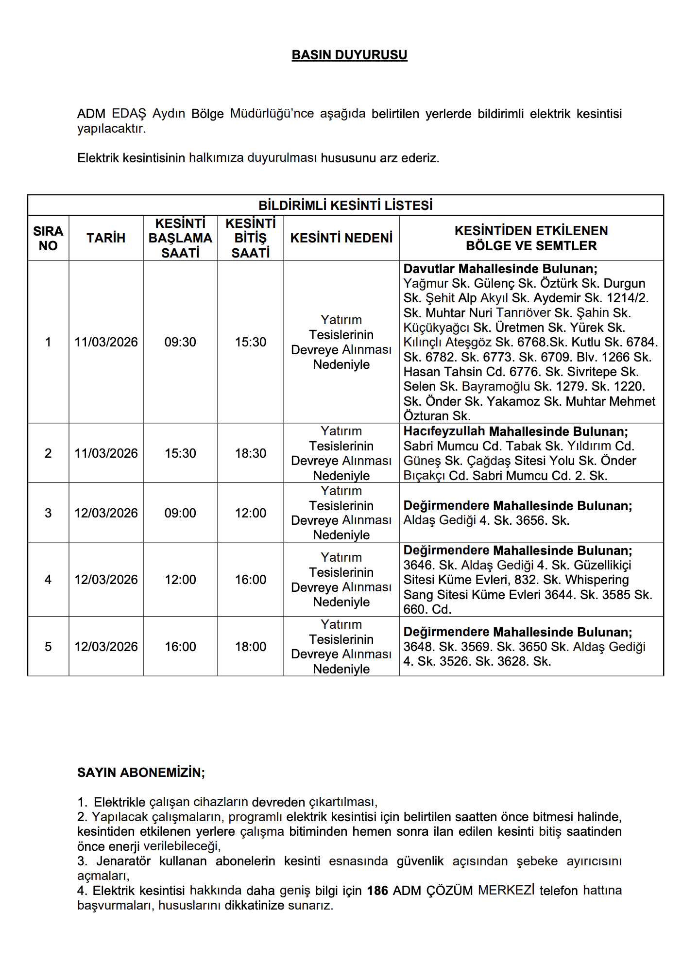 14-02-202615-16 Mart Elektrik Kesintisi Duyurusu