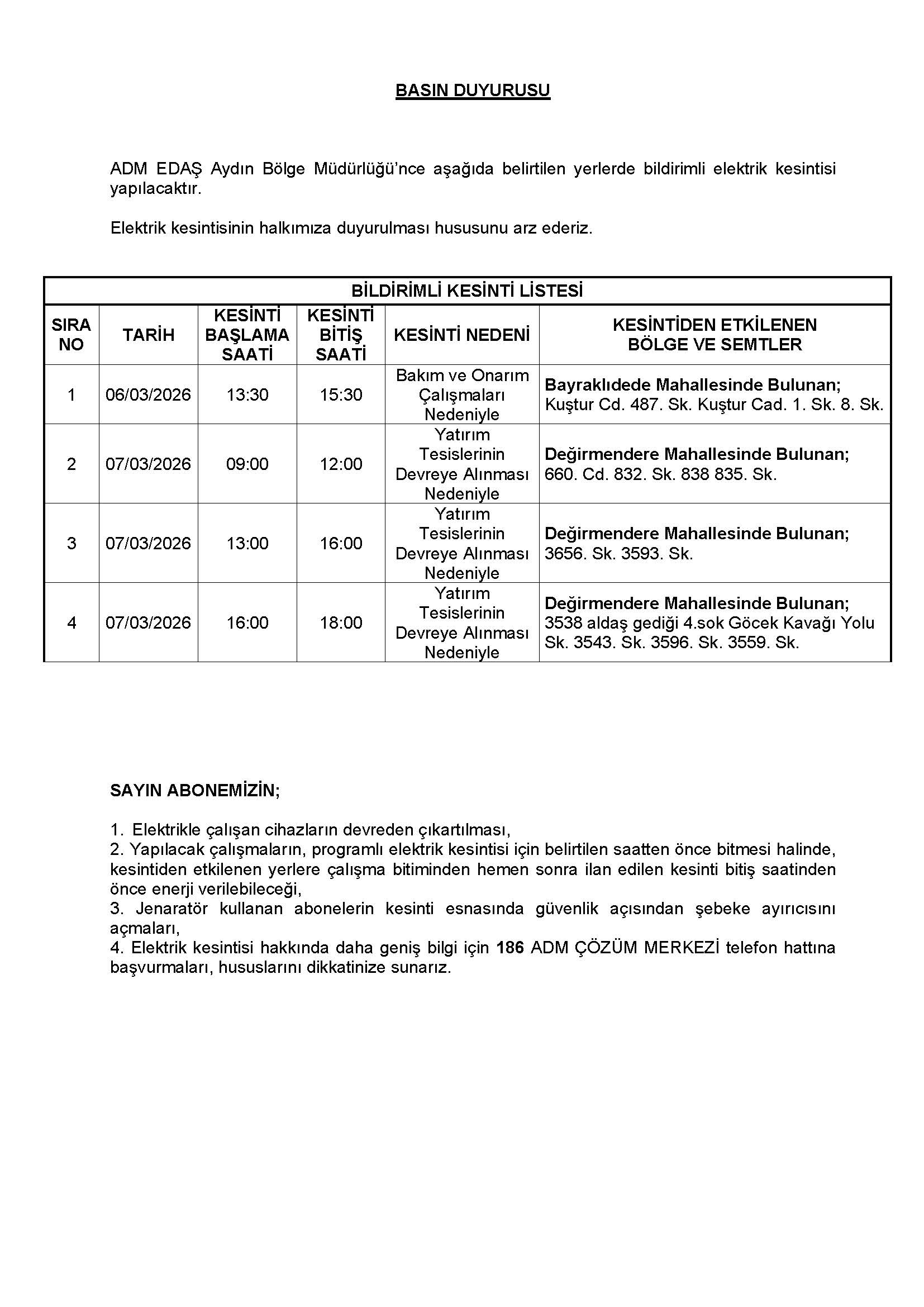 14-02-20266-7 Mart 2026 Elektrik Kesintisi Duyurusu