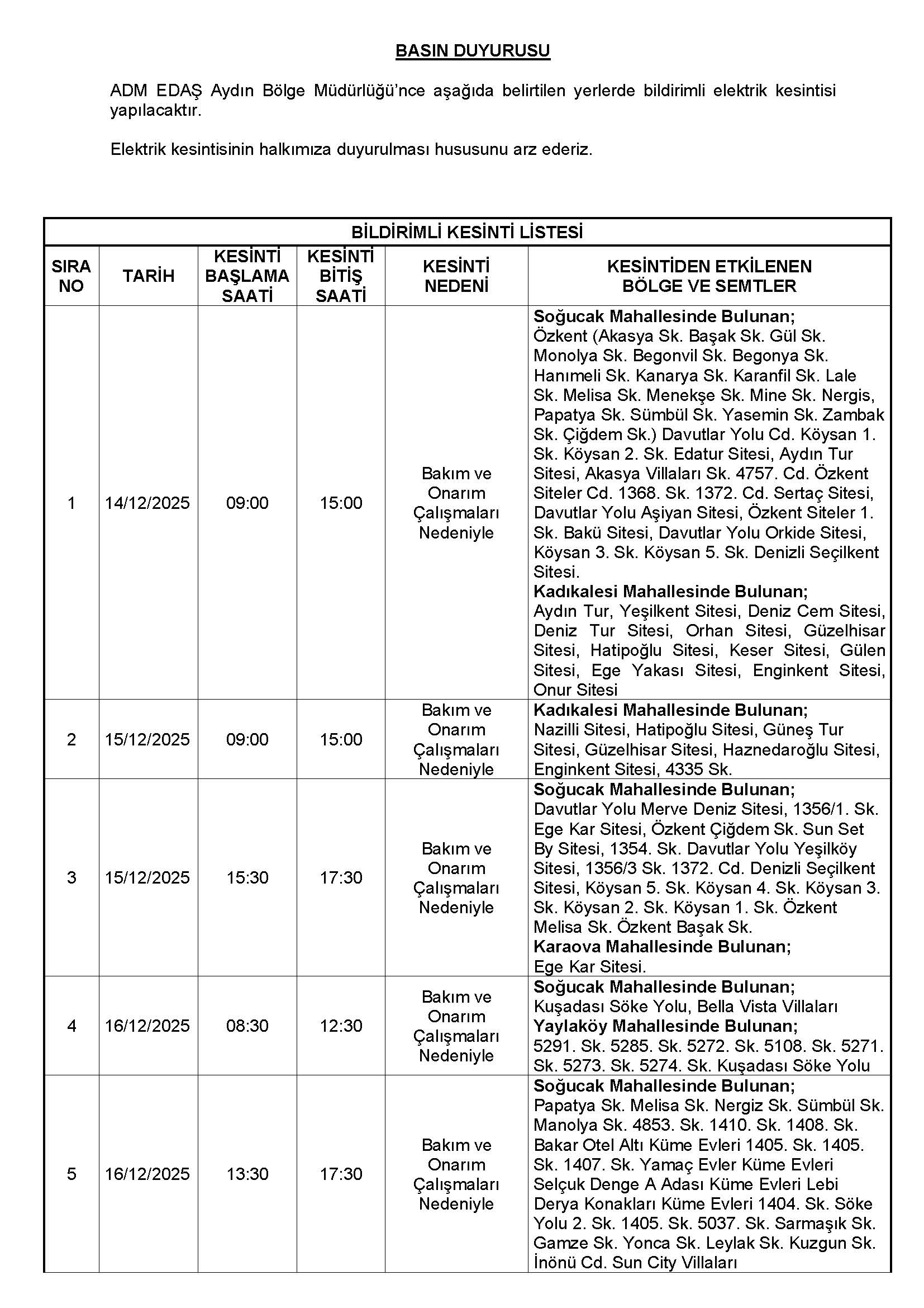 12-14 Aralık 2025 Elektrik Kesintisi Duyurusu