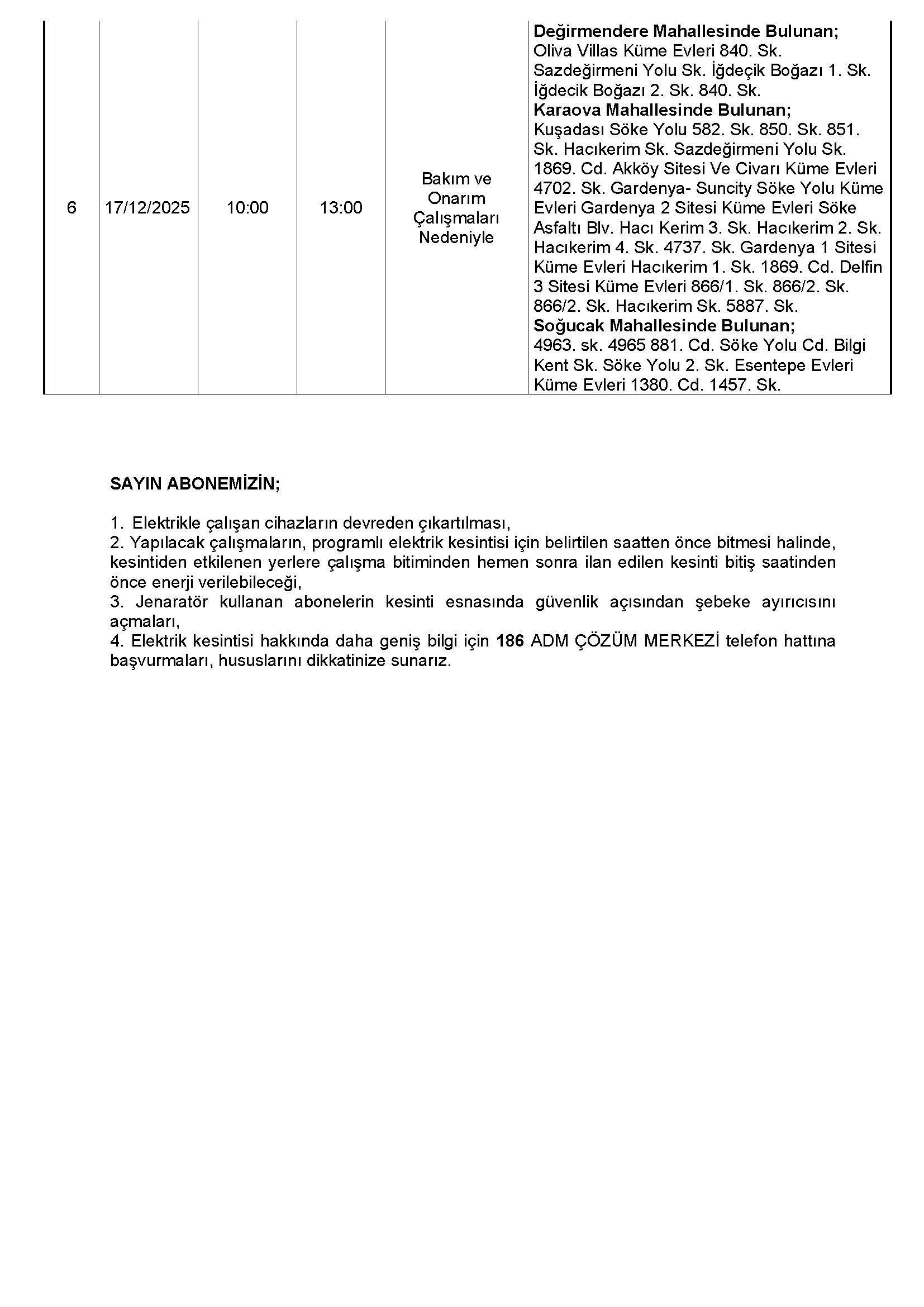 14-17 Aralık 2025 Elektrik Kesintisi Duyurusu