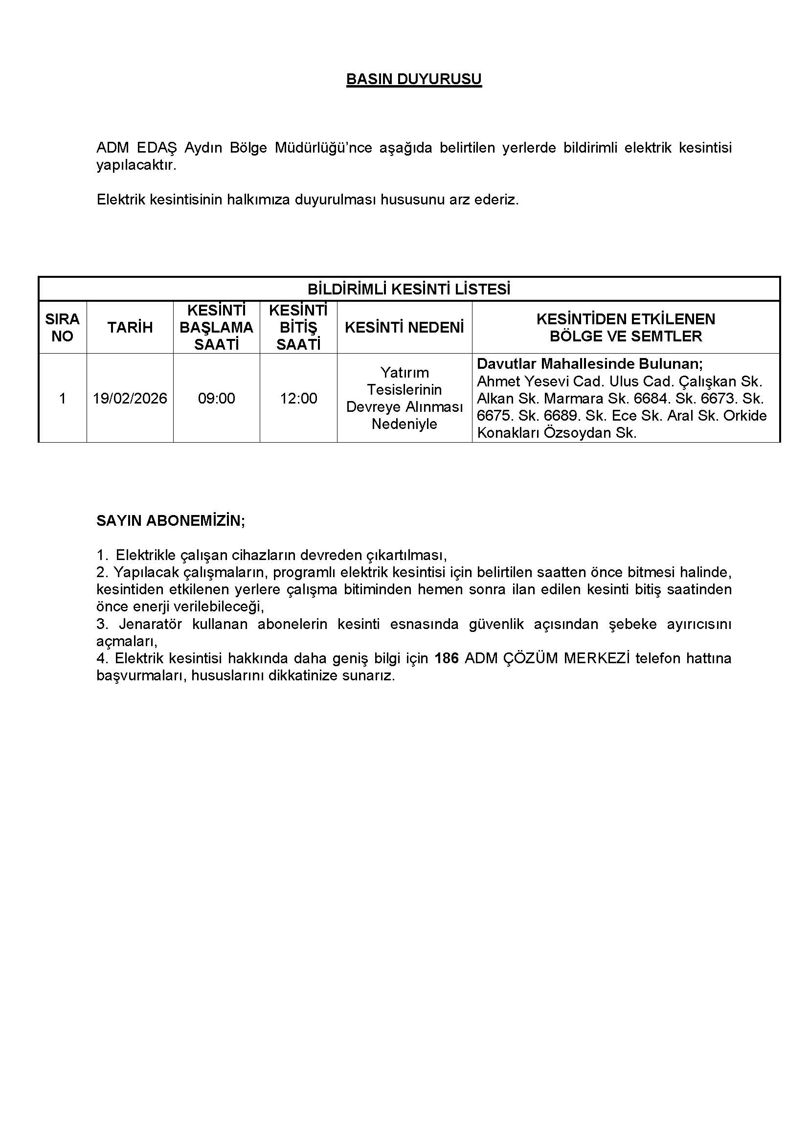 19 Şubat 2026 Elektrik Kesintisi Duyurusu