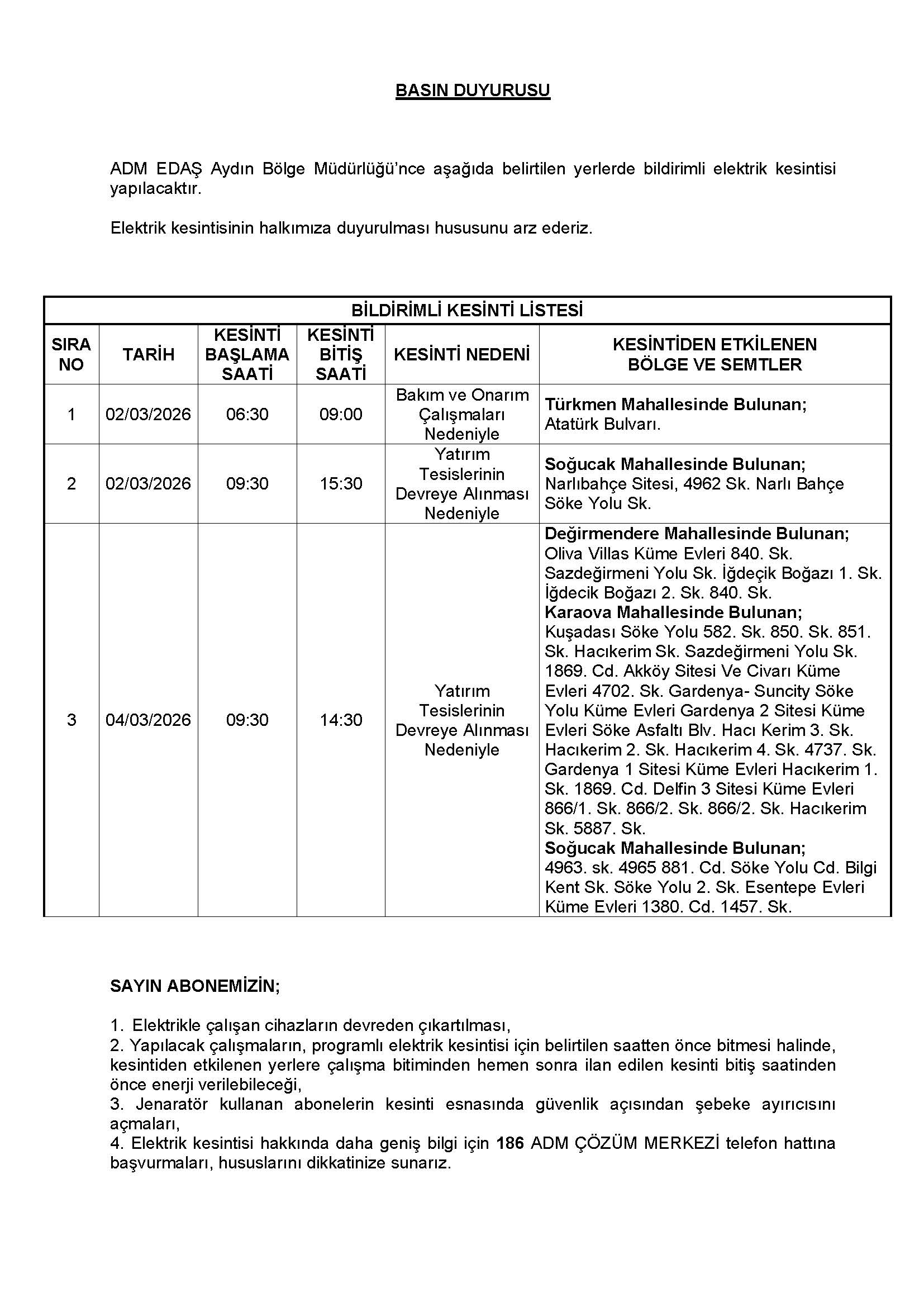 14-02-20262-4 Mart 2026 Elektrik Kesintisi Duyurusu