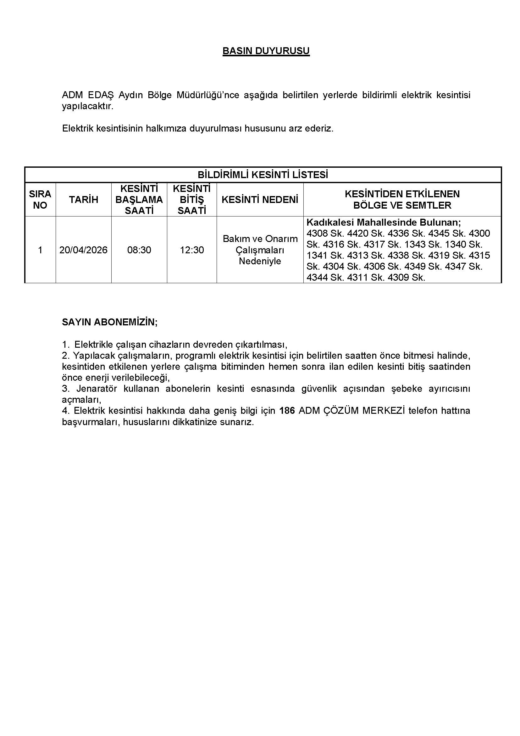 20 Nisan 2026 Elektrik Kesintisi Duyurusu
