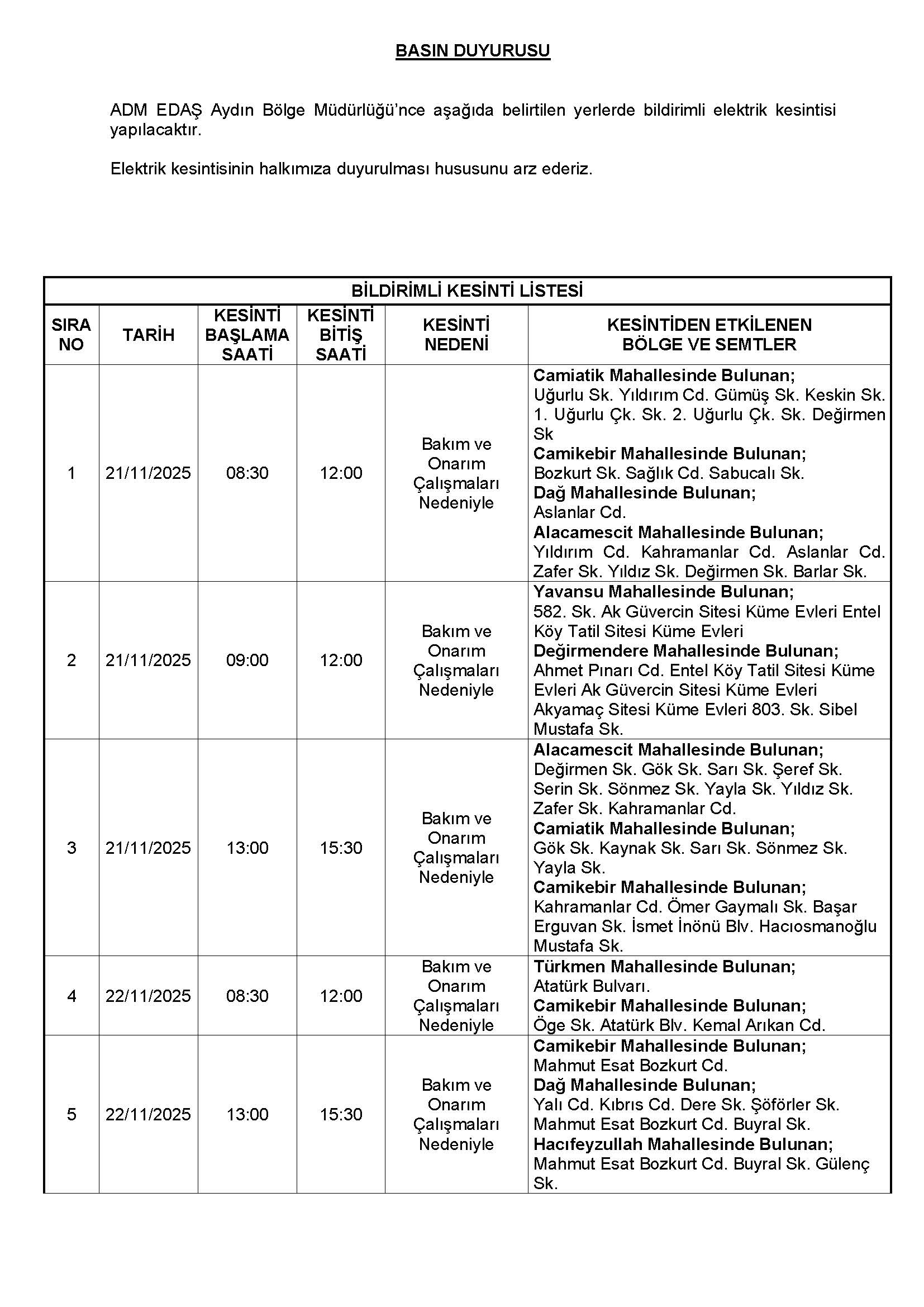 15-11-202521-22 Kasım 2025 Elektrik Kesintisi Duyurusu