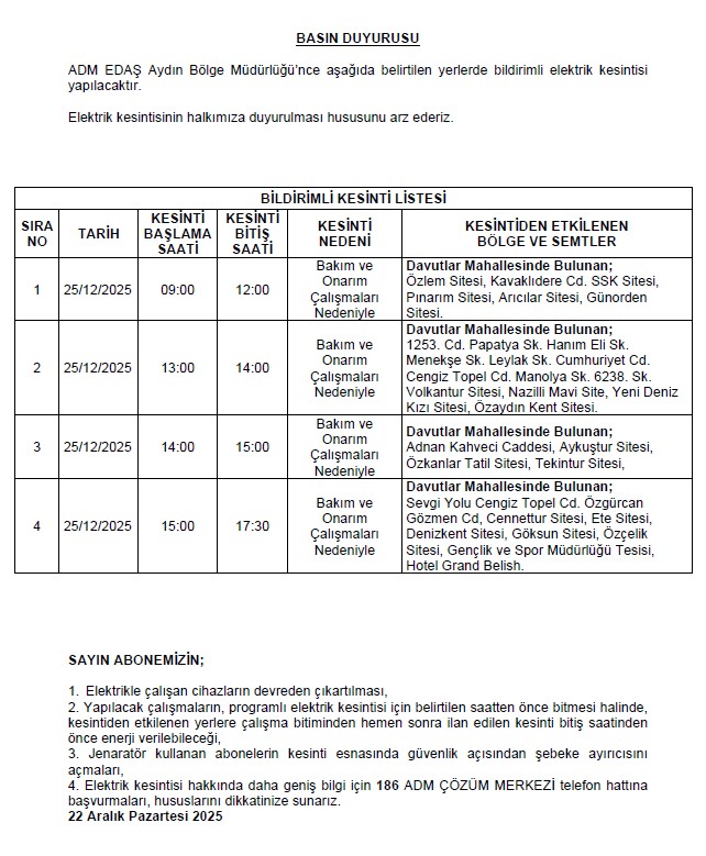 25 Aralık 2025 Elektrik Kesintisi Duyurusu