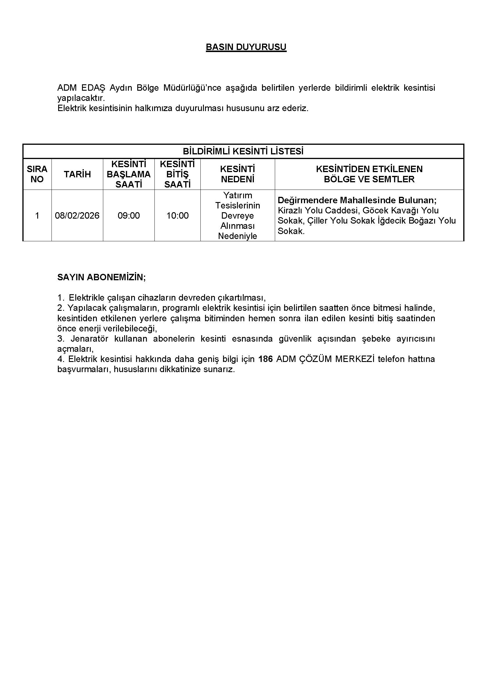 8 Şubat 2026 Elektrik Kesintisi Duyurusu