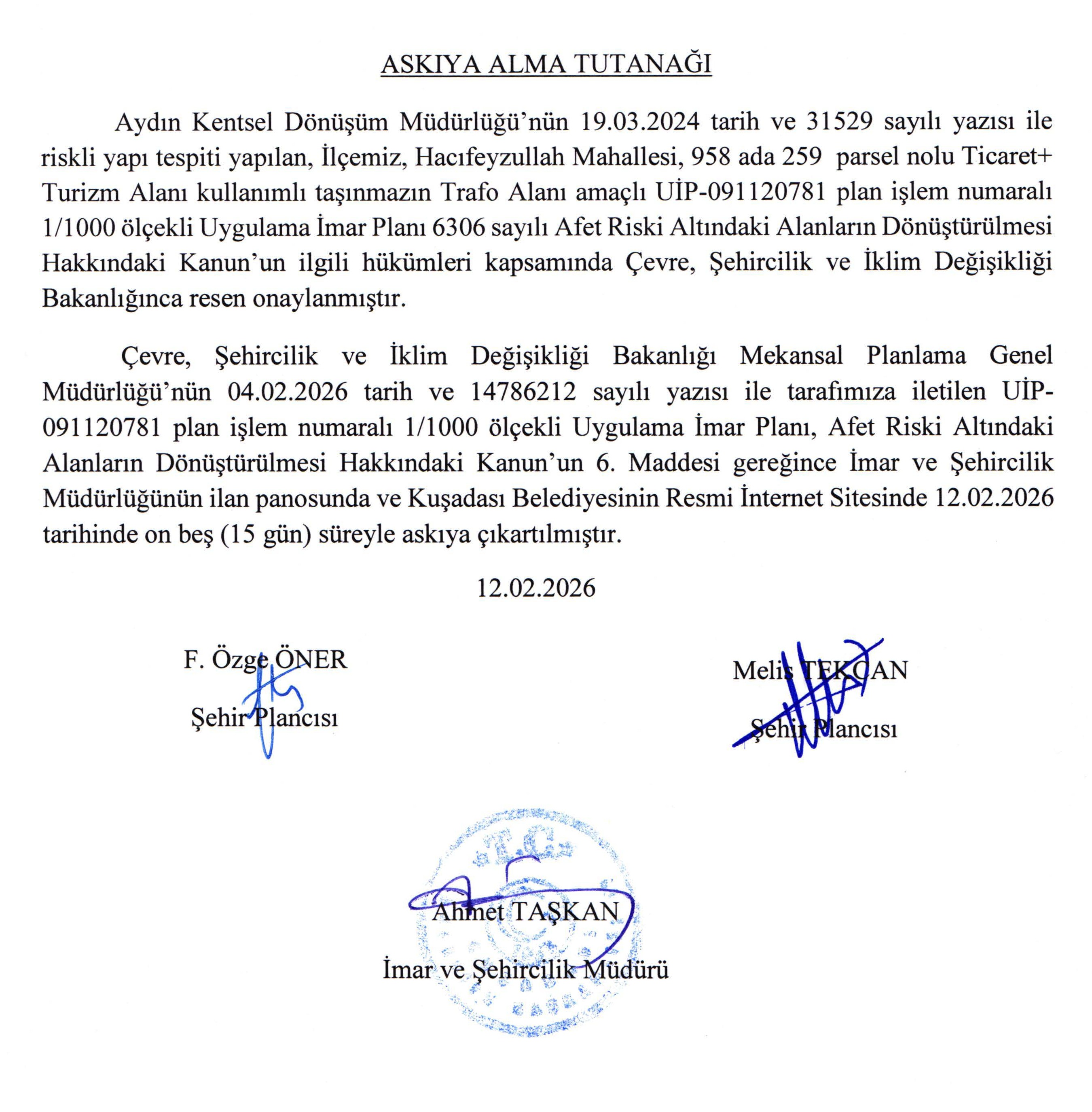 Hacıfeyzullah Mahallesi 958 Ada 259 Parsel UİP Değişikliği İlan Askı Tutanağı