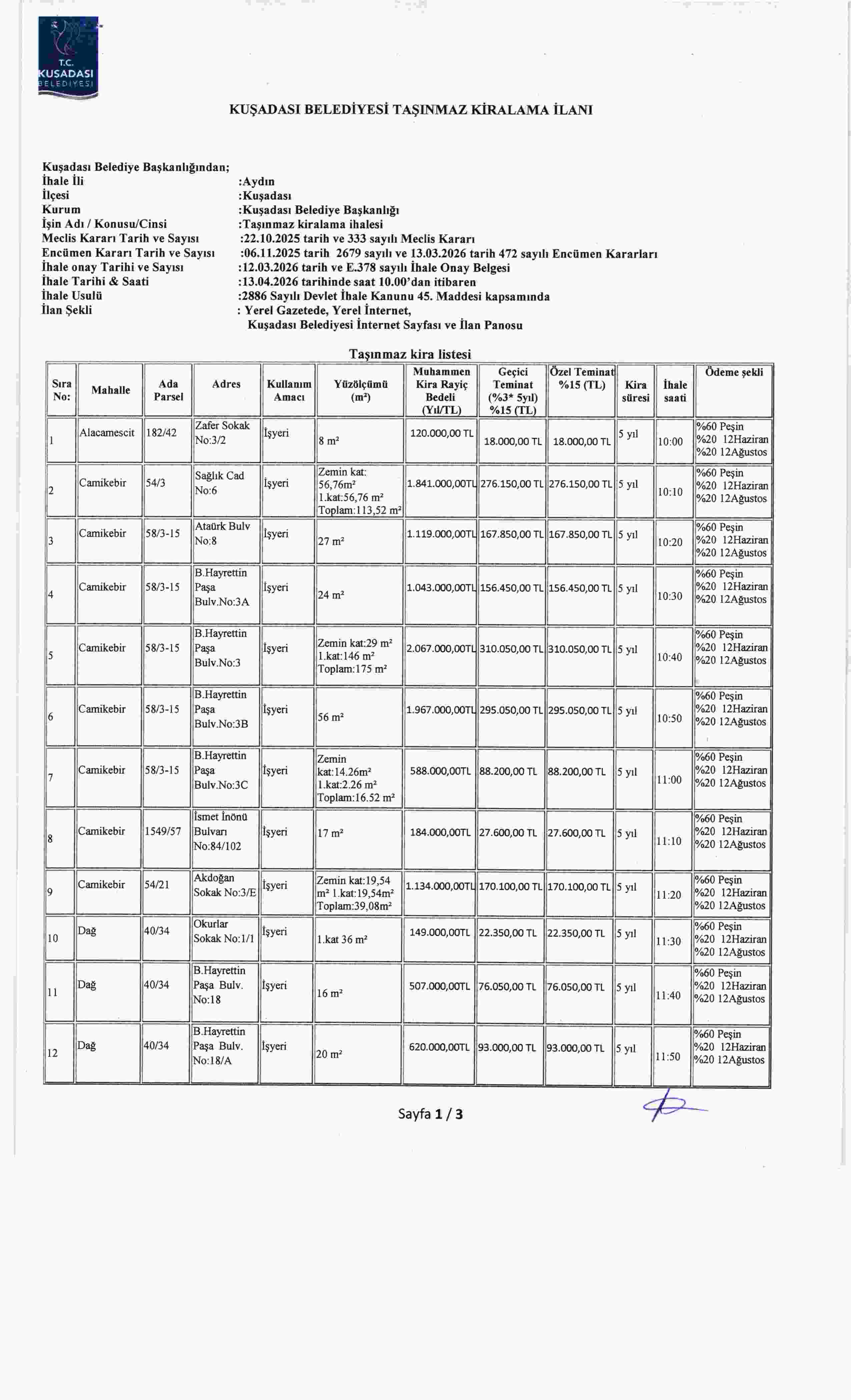 08-03-2026Kuşadası Belediye Başkanlığı'ndan 16 Nisan 2026 Tarihli Taşınmaz Kiralama İhalesi İlanı