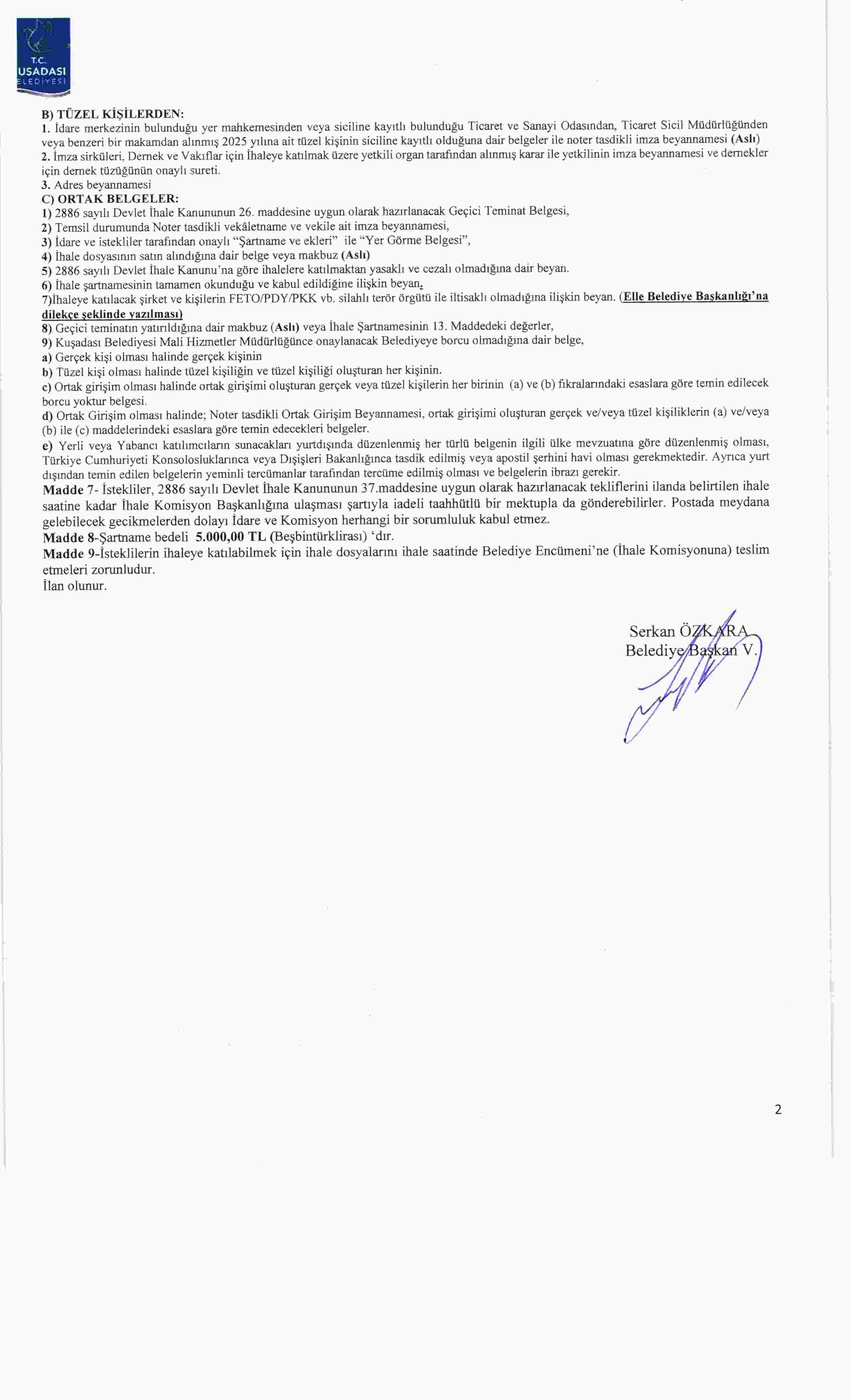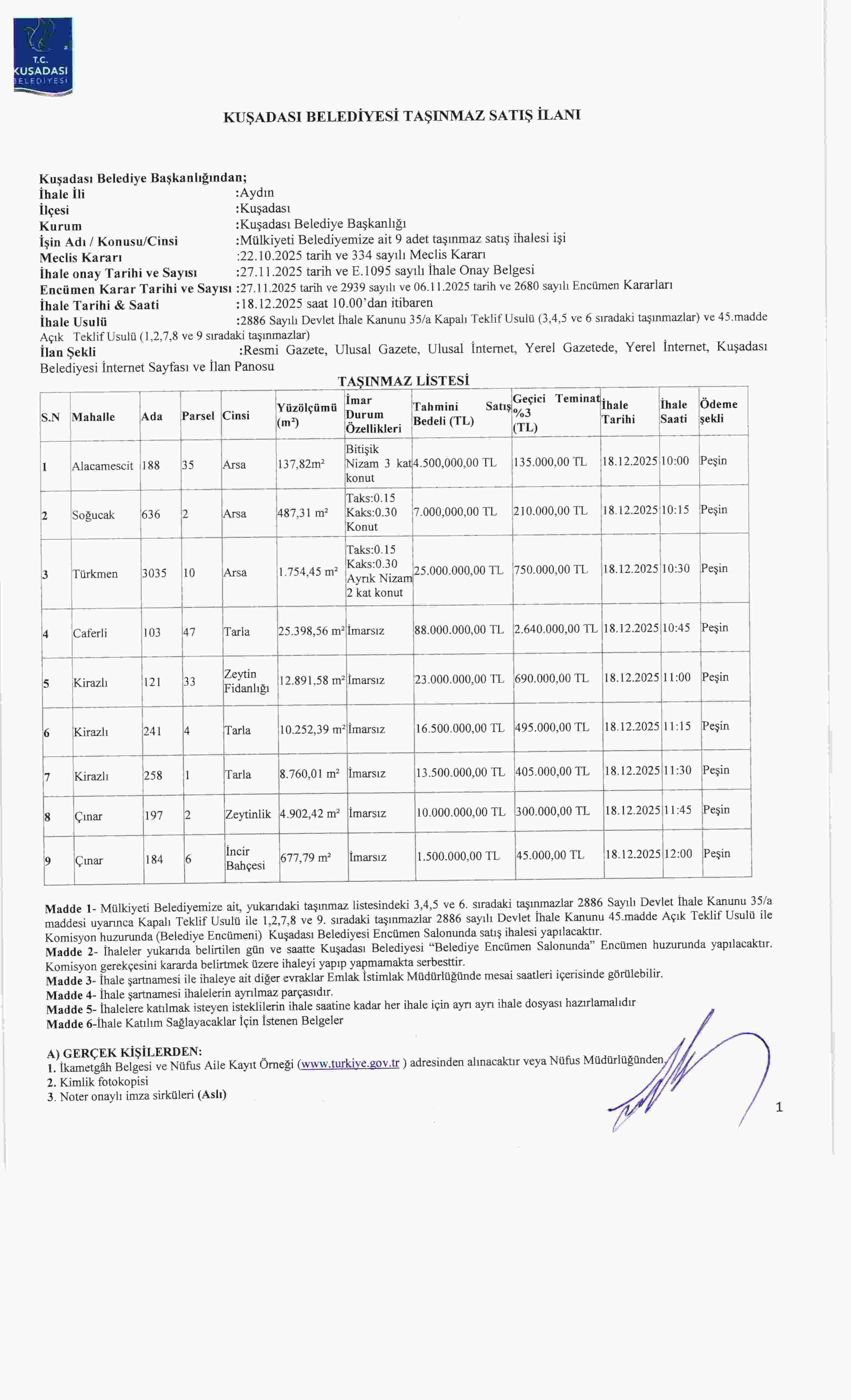 28-11-2025Kuşadası Belediye Başkanlığı'ndan 18 Aralık 2025 Tarihli Taşınmaz Satış İhalesi İlanı