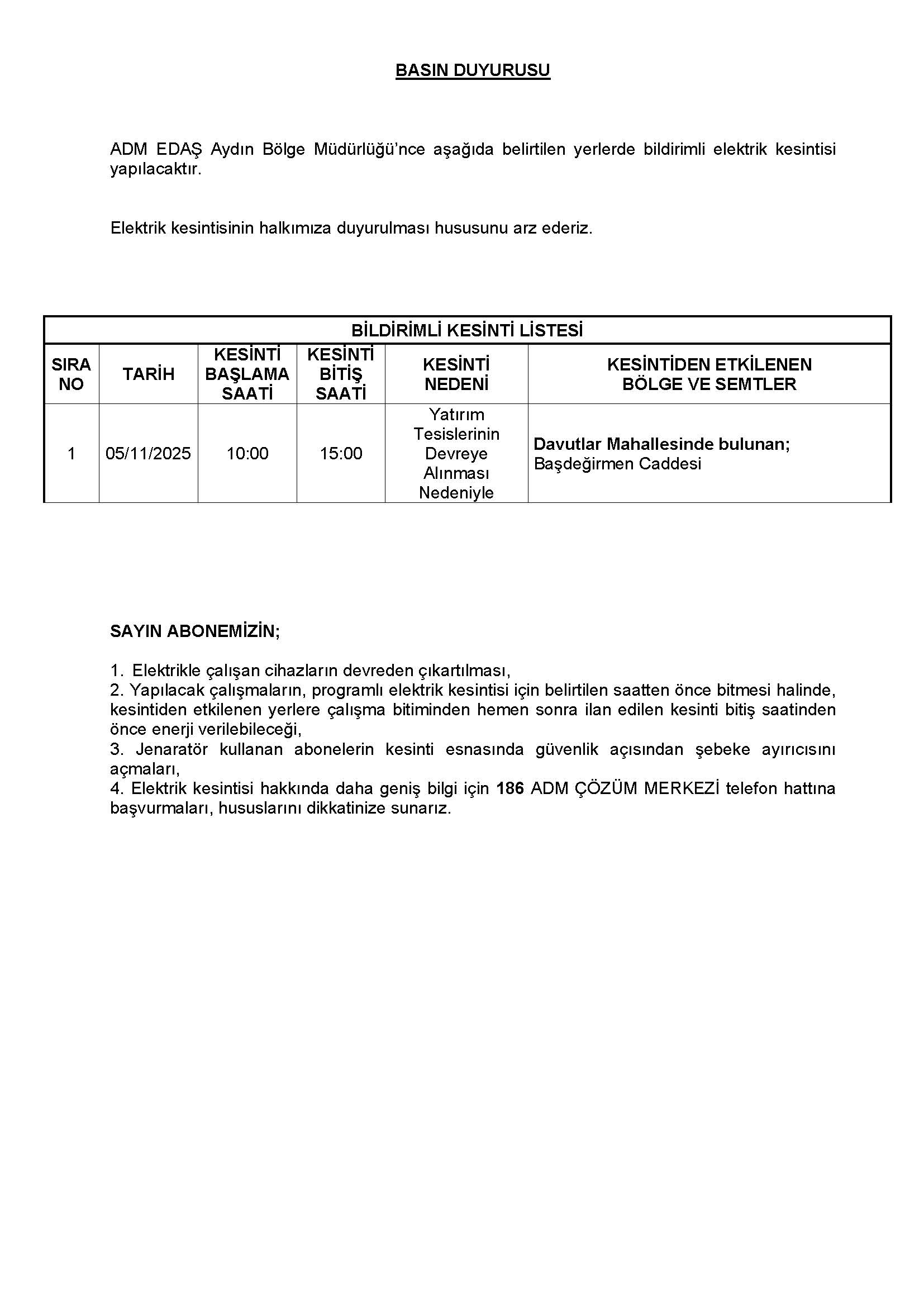 3-5 Kasım 2025 Elektrik Kesintisi Duyurusu
