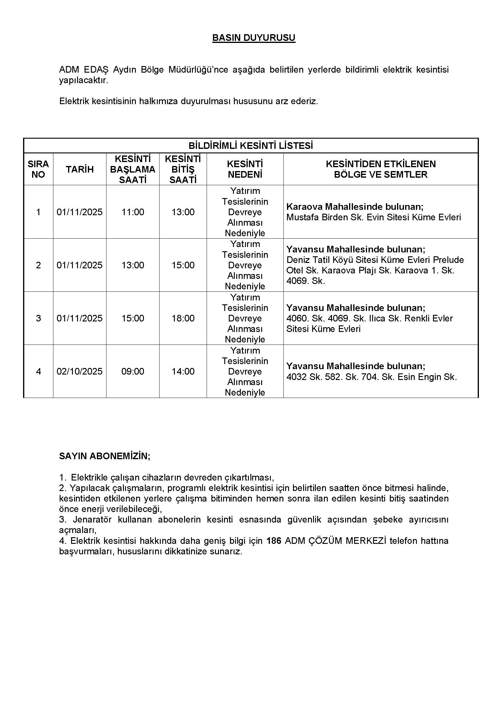 29-10-20251-2 Kasım 2025 Elektrik Kesintisi Duyurusu