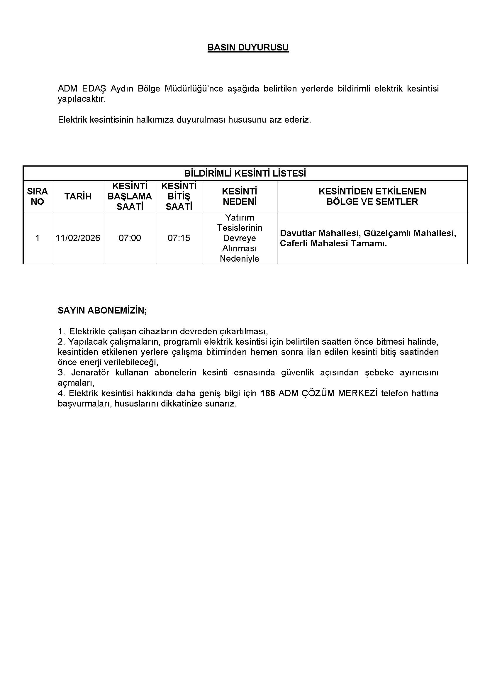 11 Şubat 2026 Elektrik Kesintisi Duyurusu