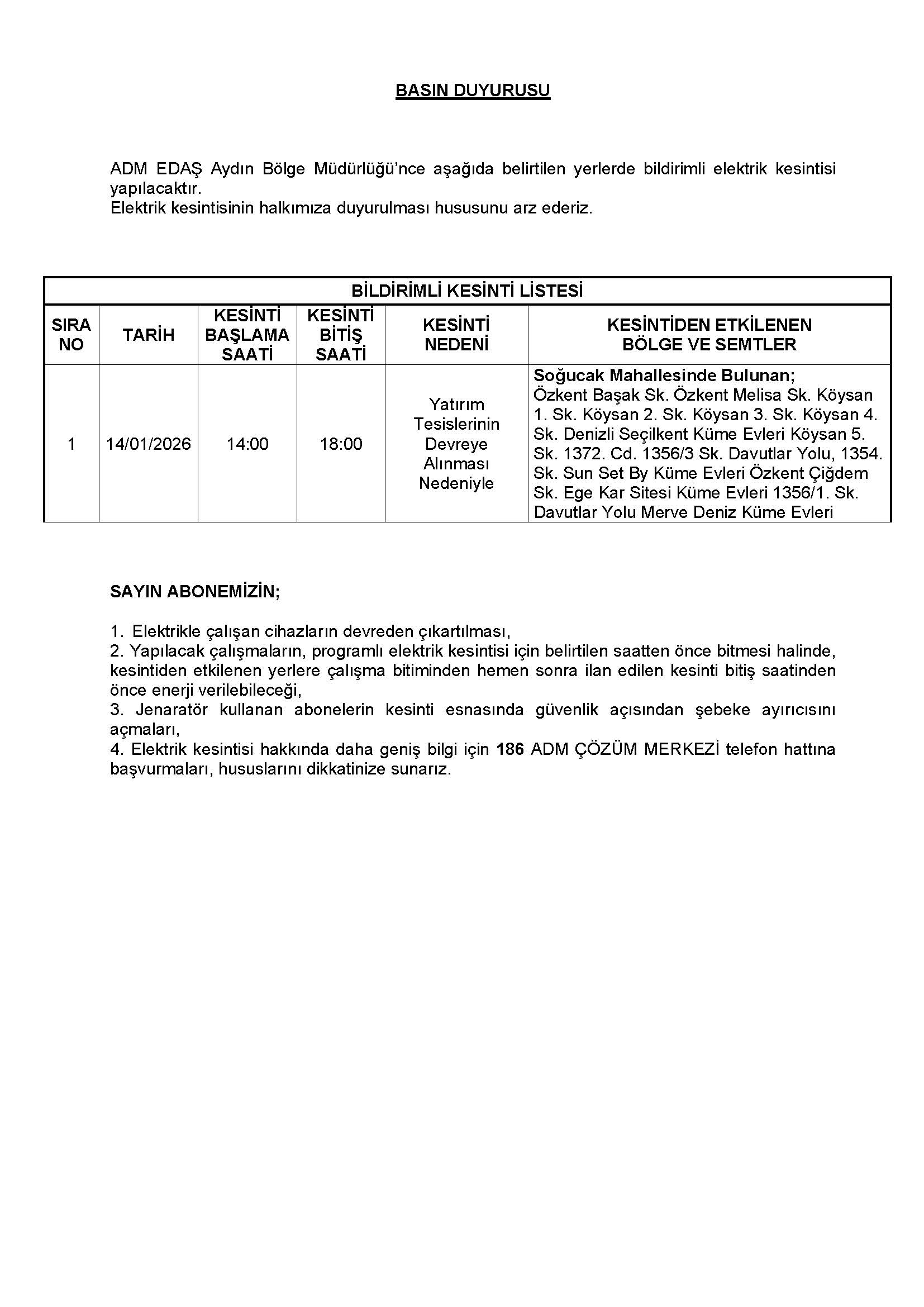 19-12-202514 Ocak 2026 Elektrik Kesintisi Duyurusu