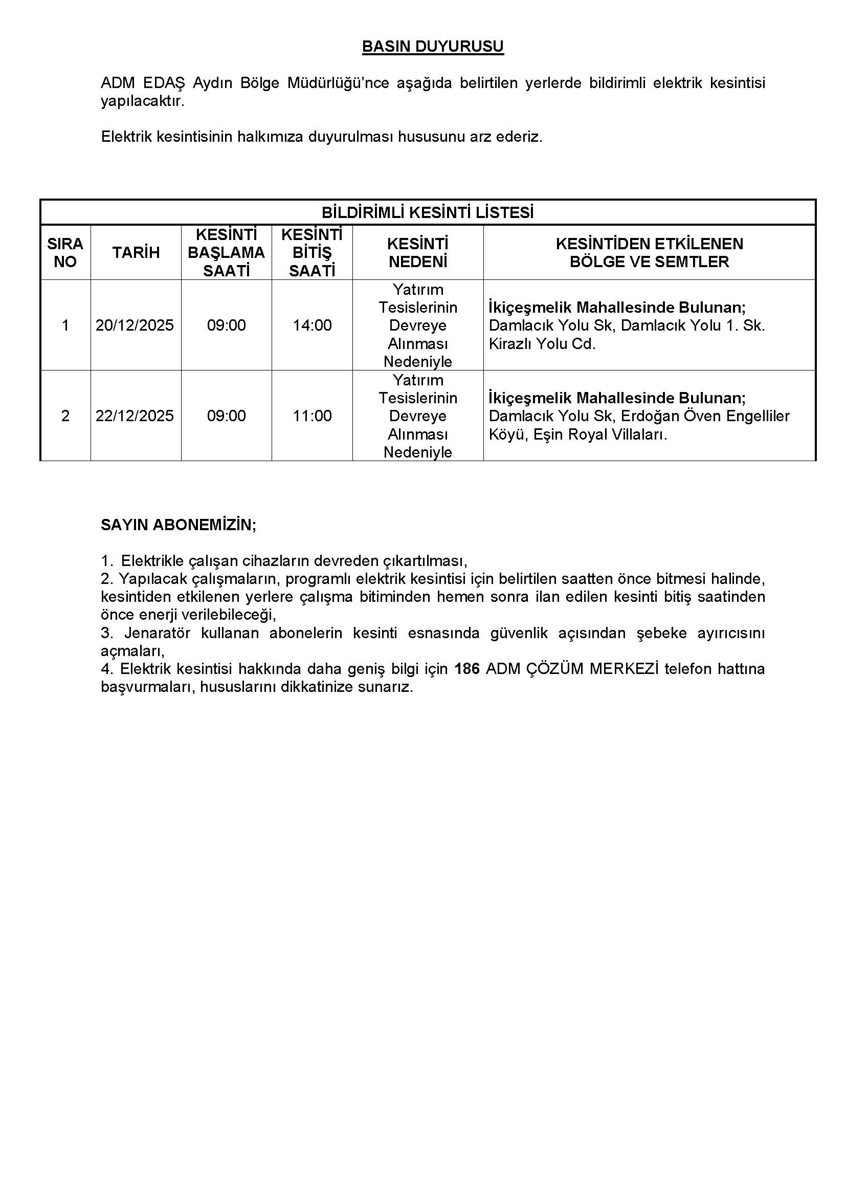 20-22 Aralık 2025 Elektrik Kesintisi Duyurusu