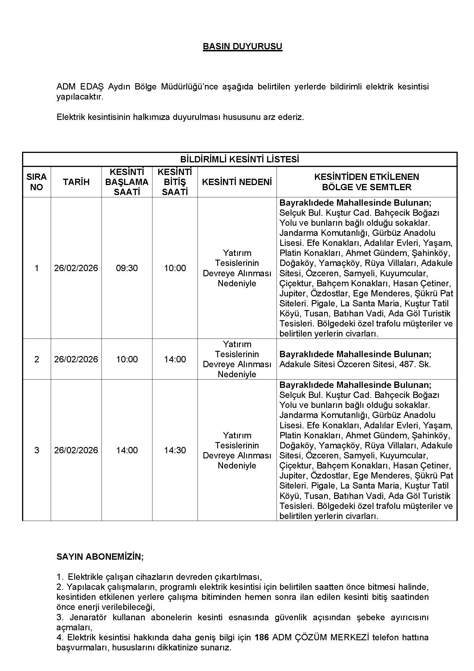 26 Şubat 2026 Elektrik Kesintisi Duyurusu