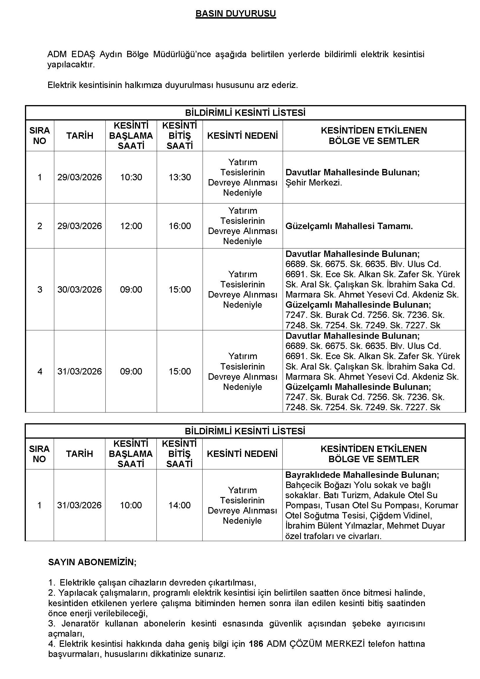 29-31 Mart 2026 Elektrik Kesintisi Duyurusu