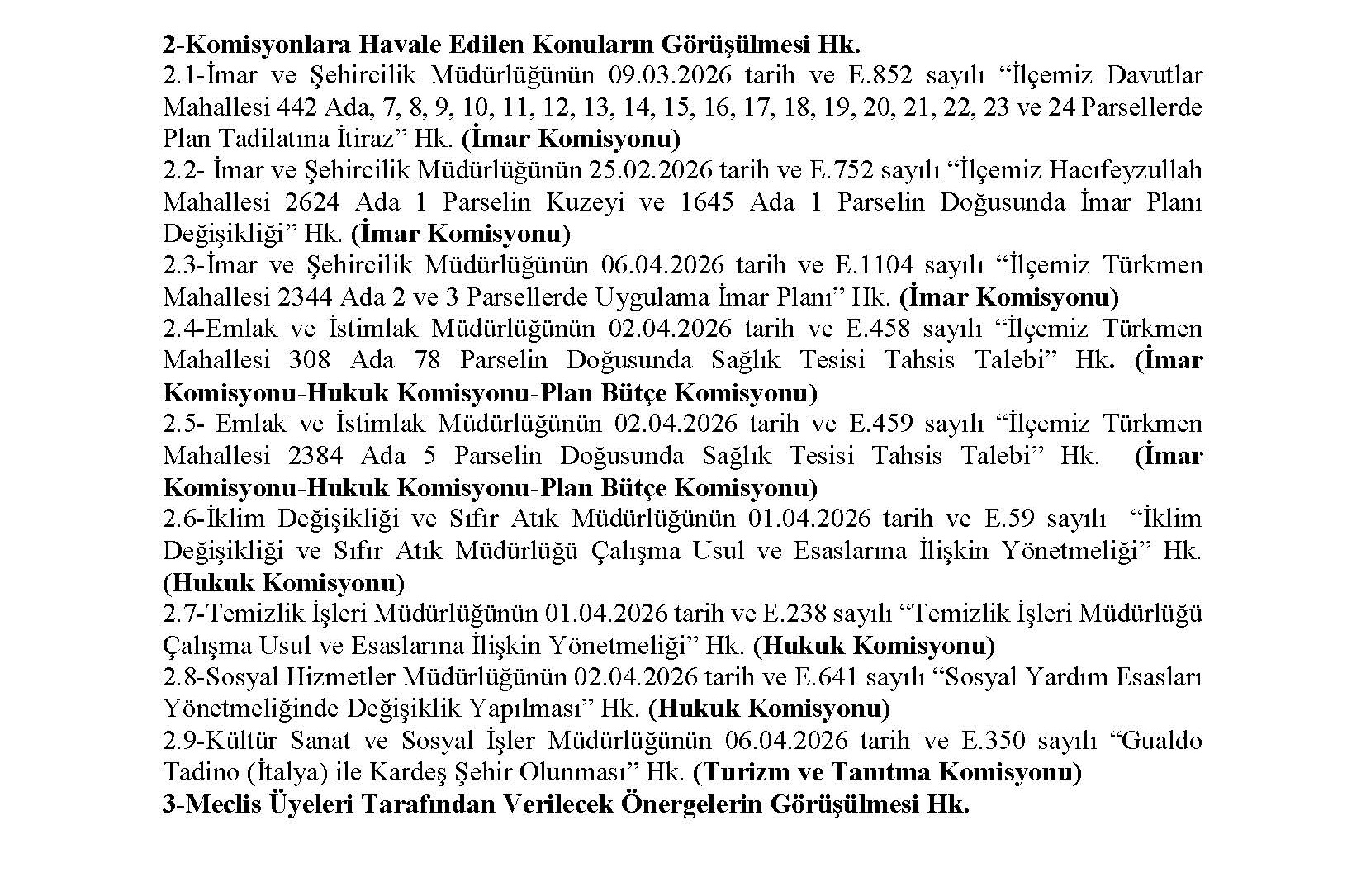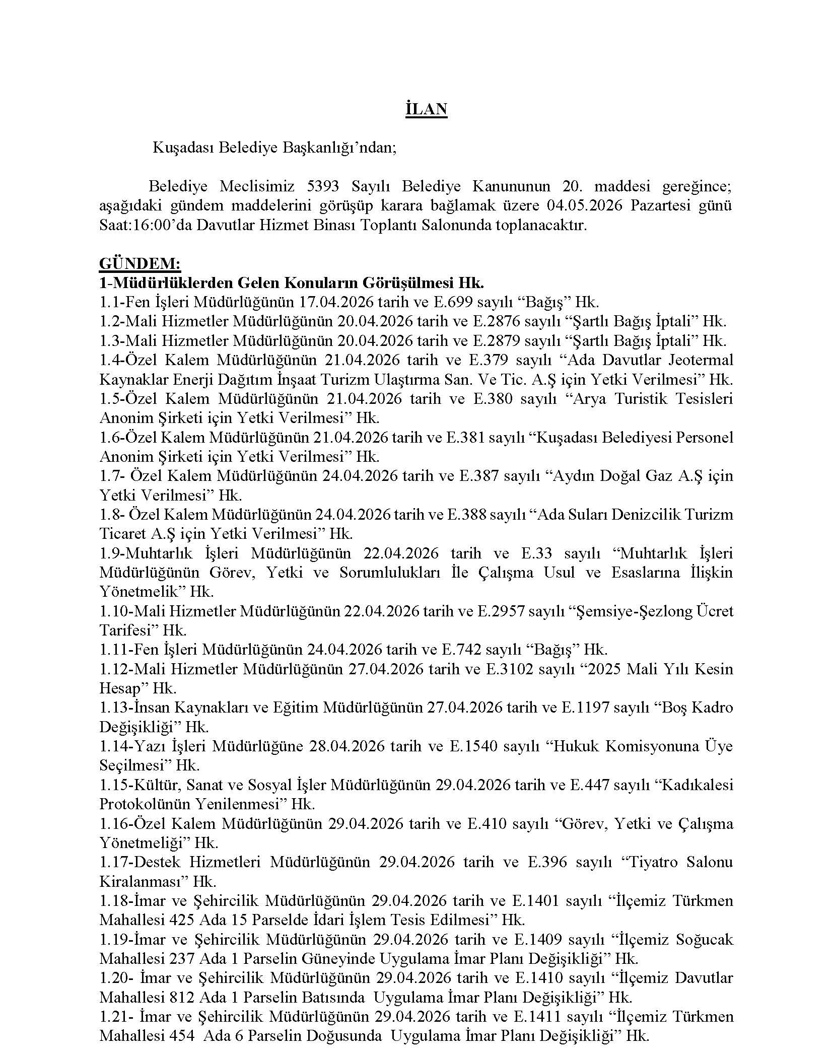 23-04-20264 Mayıs 2026 Tarihli Belediye Meclis Toplantısı Gündemi