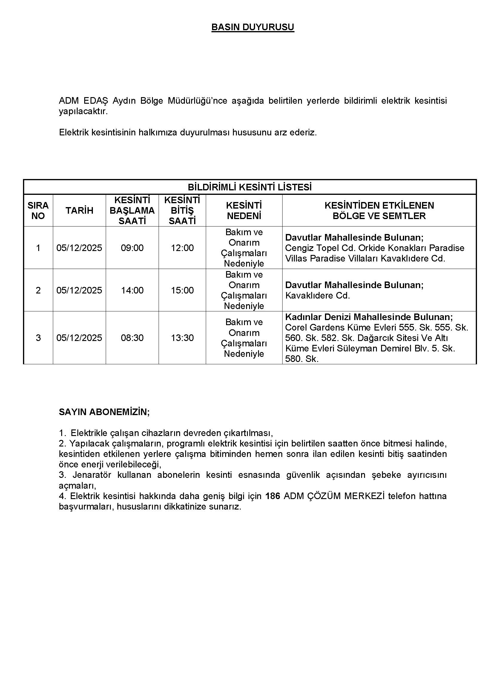 5 Aralık 2025 Elektrik Kesintisi Duyurusu