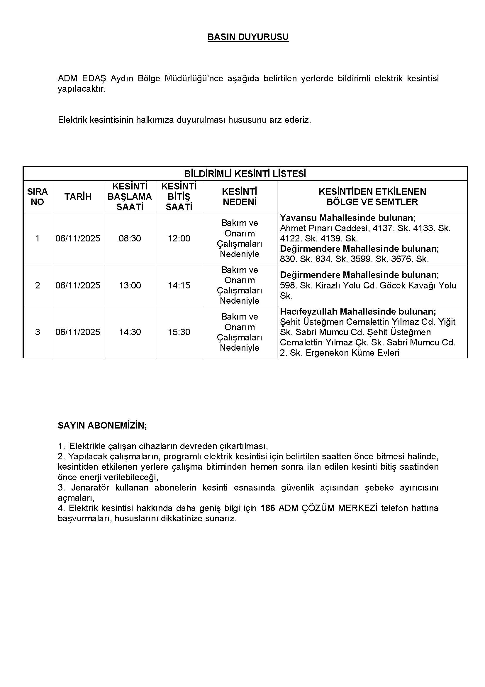 6 Kasım 2025 Elektrik Kesintisi Duyurusu