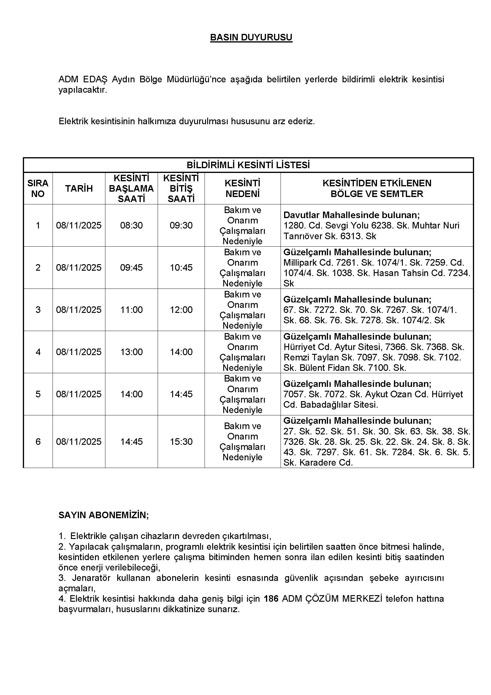 28-10-20258 Kasım 2025 Elektrik Kesintisi Duyurusu