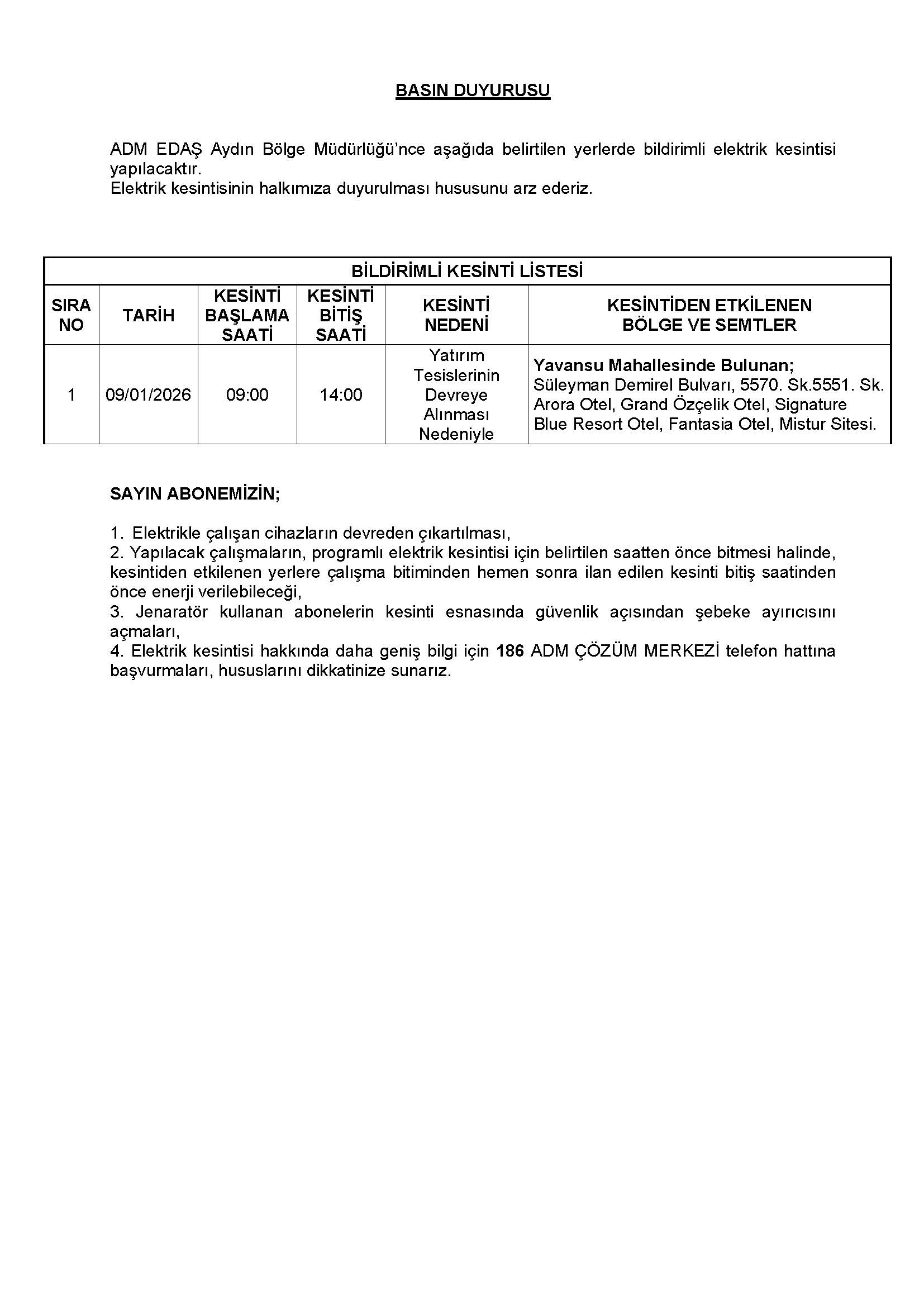 9 Ocak 2026 Elektrik Kesintisi Duyurusu