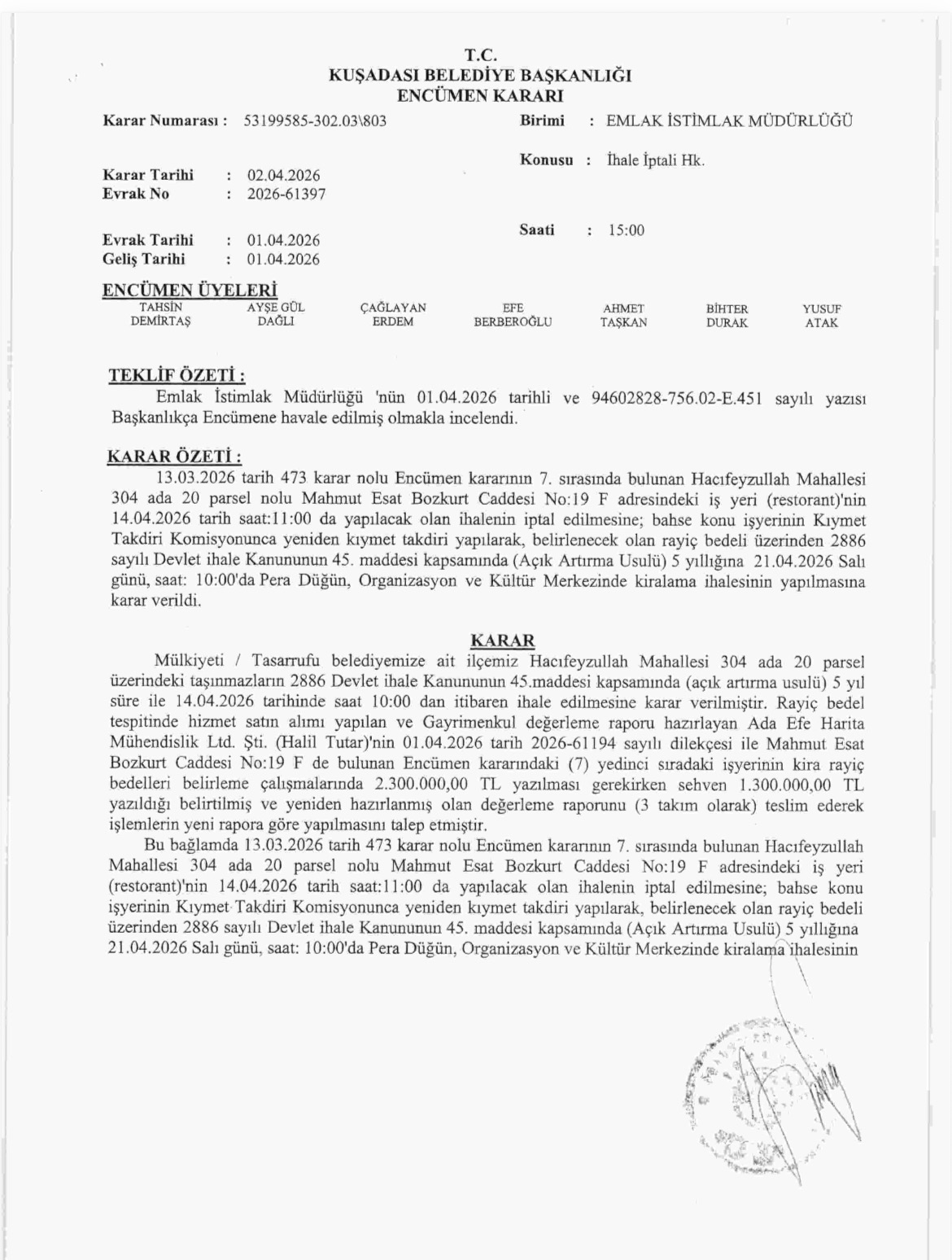 08-03-2026Kuşadası Belediye Başkanlığı’ndan İhale İptali ve Yeni İhale Tarihi Duyurusu (Hacıfeyzullah Mahallesi 304 Ada 20 Parsel Mahmut Esat Bozkurt Caddesi No:19 F)